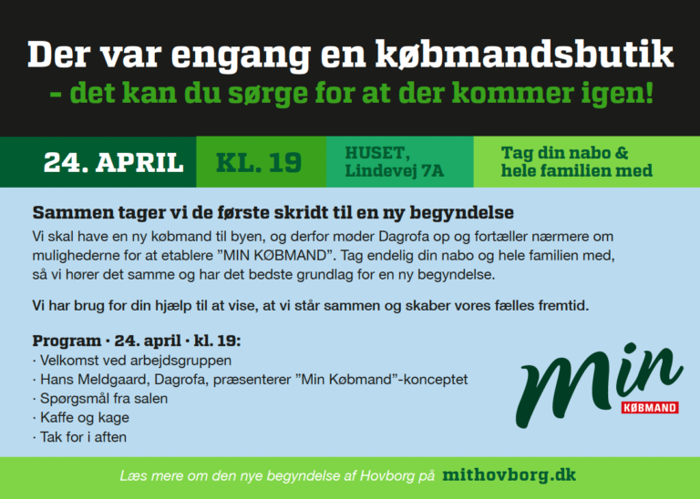 24. APRIL – Infoaften i Huset, Lindevej 7A Sammen tager vi de første skridt til en ny begyndelse Ca. 250 borgere mødte op til informationsaftenen den 24. april under overskriften: En ny begyndelse! Hans Meldgaard fra Dagrofa fortalte om mulighederne for at åbne en købmandsbutik i Hovborg som afløsning for brugsen, der lukkede to dage før. Hvis…